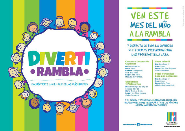 A los niños que asistan al centro comercial se les recibirá con algodones de azúcar y podrán tomarse fotos con el personaje de La Rambla, “Sweet Candie”, así como participar de un concurso de decoración de cupcakes, show infantil, entre otros.