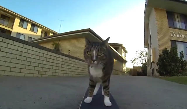 Gata amaestrada recorriendo las calles sobre ruedas.