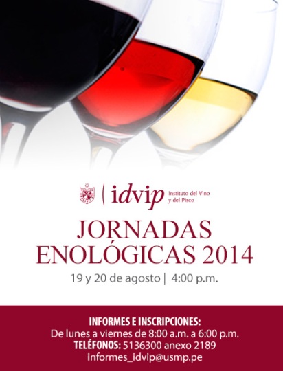 El Instituto del Vino y del Pisco (IDVIP) de la Universidad San Martín de Porres organizará este 19 y 20 de agosto las primeras “Jornadas Enológicas 2014” con la participación de especialistas peruanos y españoles. Este evento, único en el país, se realizará con el objetivo de presentar el resultado de diversas investigaciones académicas sobre la trascendencia histórica y posicionamiento actual del vino peruano en América.