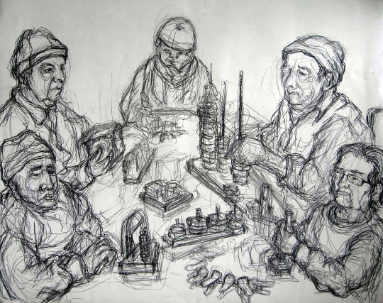 El ejercicio consistió en retratarlos -sin decirles que estén inmóviles o en alguna postura específica- en una situación espontánea, donde puedan conversar y sentir que se trataba de una visita. Así, la artista los fue retratando uno a uno, en breve lapso, pues la idea era incomodar lo menos posible, permanecer el tiempo adecuado a fin de hacerlos sentir bien, posteriormente las visitas fueron con motivos de compartir o hacer bocetos y dibujos, siendo siempre el punto clave la conversación. Así se logró obtener testimonios de vida, pues cada vez que la artista terminaba un cuadro se sentaba a escribir. Más que la representación de un retrato, es el dibujo de la vida diaria dentro del espacio, sus rutinas y todo lo que sucedía en el área de terapia física, ya que fue esta especialidad la que acogió el proyecto.