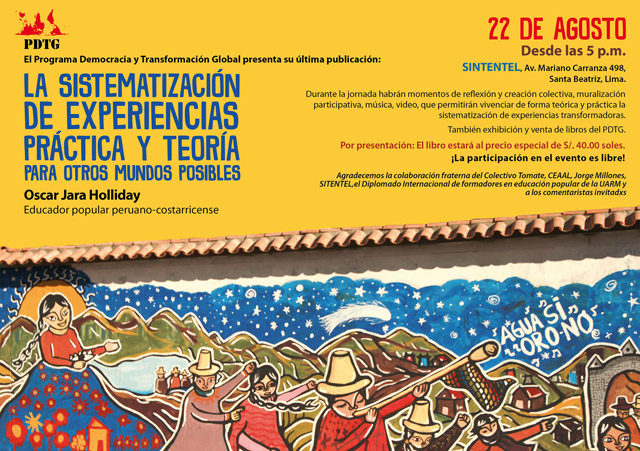 · Esta nueva publicación del Programa Democracia y Transformación Global que inaugura la Colección Educación Popular y Saberes Libertarios, se basa en una vida de trabajo como educador popular de Oscar Jara que ha resultado en un marco teorico y practico de la sistematización de experiencias. La sistematización de experiencias trata de una reflexión colectiva y crítica de procesos sociales para aprender de ello, y potenciar las luchas por un mundo mejor.