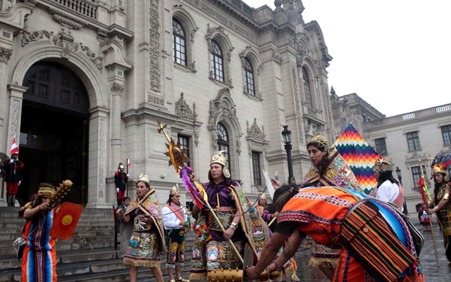 Precisamente en el Patio de Honor de la sede del Ejecutivo se pudo observar diversas danzas como el Apu Inca, en la que participan adultos, hombres y mujeres, que forman dos grupos: la corte incaica y la comitiva de españoles; la danza de la coya exclusiva para mujeres, el Carachaqui, donde participan niños bailarines.