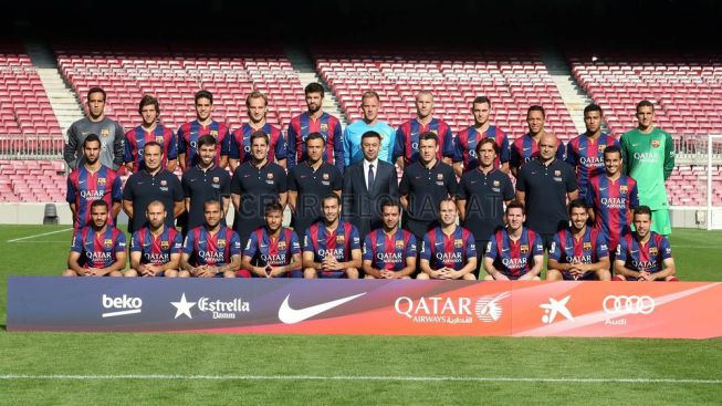 La primera plantilla se ha hecho hoy miércoles la tradicional fotografía oficial en el Camp Nou, correspondiente a la temporada 2014/15.