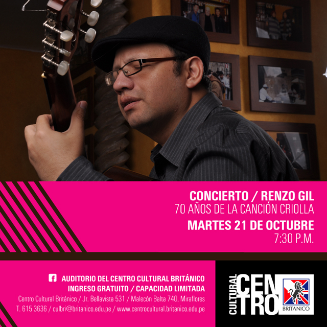 Gracias al Centro Cultural Británico, el intérprete y guitarrista nos presentará, en Concierto, temas cantados e instrumentales de su repertorio en el que incluye obras de los autores más renombrados de la música popular costeña, tales como, Felipe Pinglo Alva, Luis Abelardo Núñez, Alicia Maguiña, Manuel Acosta Ojeda, Serafina Quinteras, Eduardo Márquez Talledo, Pablo Casas entre otros.