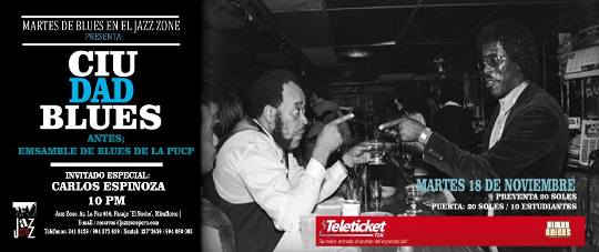 Este Martes 18, la banda emblemática Ciudad Blues II junto a un gran invitado especial el maestro Carlos Espinoza con los grandes hits de los clásicos del Blues, Rock&Blues y Blues&Funky en el Jazz Zone Perú desde las 10pm. Empieza la noche con el ensamble de Blues de la Escuela de música de la PUCP.