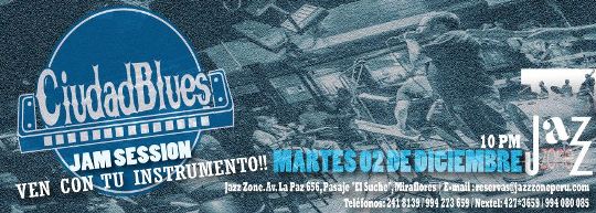 Martes 02 de Dic. Ciudad Blues II regresa con los clásicos del Blues, Rock&Blues y el Funk&Blues en el Jazz Zone Perú desde las 10pm. Luego del show, no te pierdas del Jam Sessión, así que trae tu Instrumento!!