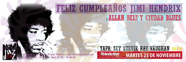 Este Martes 25, regresa Ciudad Blues II y esta vez junto a Allan Belt presentando un super Tributo a Jimi Hendrix por su cumpleaños y luego lo clásicos de Stevie Ray Vaughan en el Jazz Zone Perú a las 10pm.