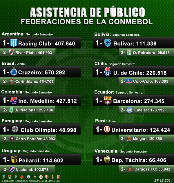 En un ránking que se hizo país por país, la Conmebol ha reconocido en Perú a Universitario de Deportes como el equipo que «mandó en la popular» y que más gente llevó a los estadios donde jugó. El cuadro merengue tiene 124 mil 424 asistentes y detrás está Melgar con 120 mil 850 espectadores.