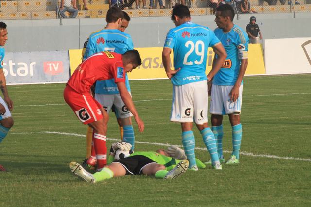 En el primer tiempo extra, Diego Penny tuvo un choque con el delantero del Juan Aurich Osnar Noronha. El meta de Sporting Cristalllevó la peor parte. La pierna del atacante chocó con la cabeza de Penny.