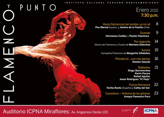 Como cada año, el ICPNA convoca a renombrados exponentes del baile y cante andaluz. Javiera de la Fuente (Chile) y el guitarrista Pau Marzal (España), son los encargados de inaugurar el festival con “Voces flamencas tan jondas, yo no sé”, para dar paso a Pasión Flamenca de las hermanas Cuéllar y su espectáculo “Duende”. El Elenco de Flamenco y Fusión de Mariana Olaechea hará lo propio para interpretar “Por segunda”. La siguiente fecha cuenta con “Aurora” de la Compañía Flamenco de Margarita Villalobos, la cual precede a Natalia Velarde, quien presenta “Péinate tú… con mis peines”. El proyecto “Bailaores”, coordinado por la cantaora María Fe de la Piedra, reúne a Diego Barrenechea, Kevin Pacora, Rafael Aguilar y Jesús Rodríguez “El Viejo”. Posteriormente, se presenta “Fuerza Flamenca” estelarizado por Cathy del Sol y el bailaor Fariña Roete (España). Cierra el festival “Canastera – Historia de los Gitanos” de Amaya Flamenco Puro, liderado por las emblemáticas Leo y Esperanza. Auditorio ICPNA Miraflores. 7:30 p.m. Boletería: S/. 40. (Viernes 9: S/. 50 / Jueves 22: S/. 80 / Viernes 23: S/. 60).