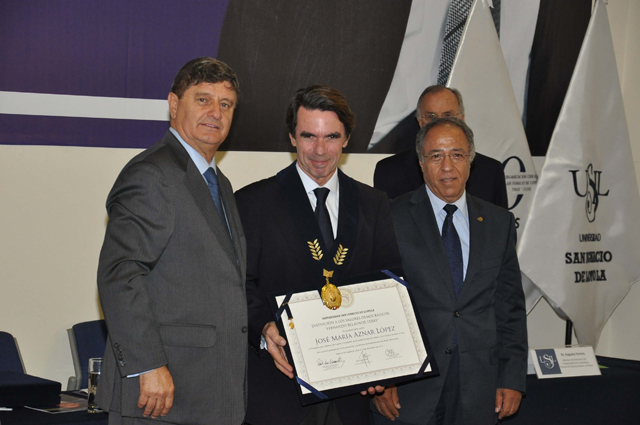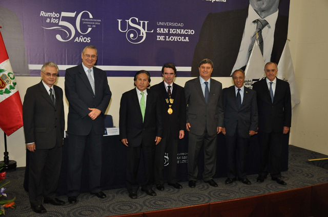 El Ex Presidente del Gobierno de España, José María Aznar, recibió la Distinción y Medalla a los Valores Democráticos “Fernando Belaunde Terry” de parte de la Universidad San Ignacio de Loyola (USIL) del Perú, en la que participaron reconocidos líderes políticos, congresistas, exministros, diplomáticos, empresarios y representantes del mundo académico peruano.
