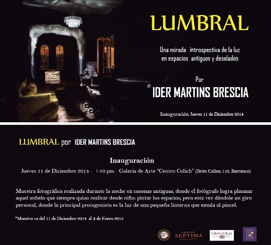 El fotógrafo peruano Ider Martins Brescia dará inicio, como expositor central, a su muestra fotográfica “Lumbral” el jueves 11 de diciembre a las 7:30 pm en el Centro Colich, con un cocktail de inauguración.
