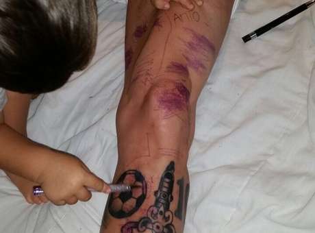 Thiago Messi, con apenas dos años, despertó ternura y comenzó a mostrar sus dotes de «tatuador» tras retocar los dibujos que su padre lleva en la pierna izquierda, a la altura del gemelo.