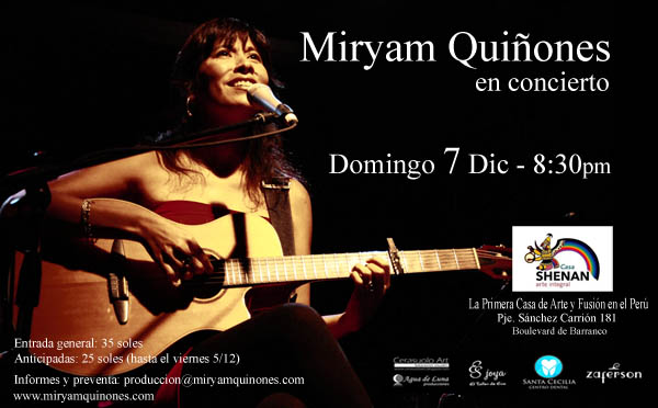 La cantora peruana Miryam Quiñones nos invita a compartir el último recital de este 2014 que se va, con un recital íntimo donde ofrecerá lo mejor de su repertorio de trova y canción latinoamericana contemporánea.