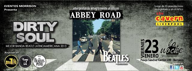 Luego de su participación en el International Beatleweek representando al Perú y Latinoamérica en Liverpool (UK), Dirty Soul nos trae un fabuloso tributo a unos de los mejores álbumes de los 4 de Liverpool el «Abbey Road». La banda interpretará de manera fiel los temas de este emblemático album en la carrera de The Beatles.