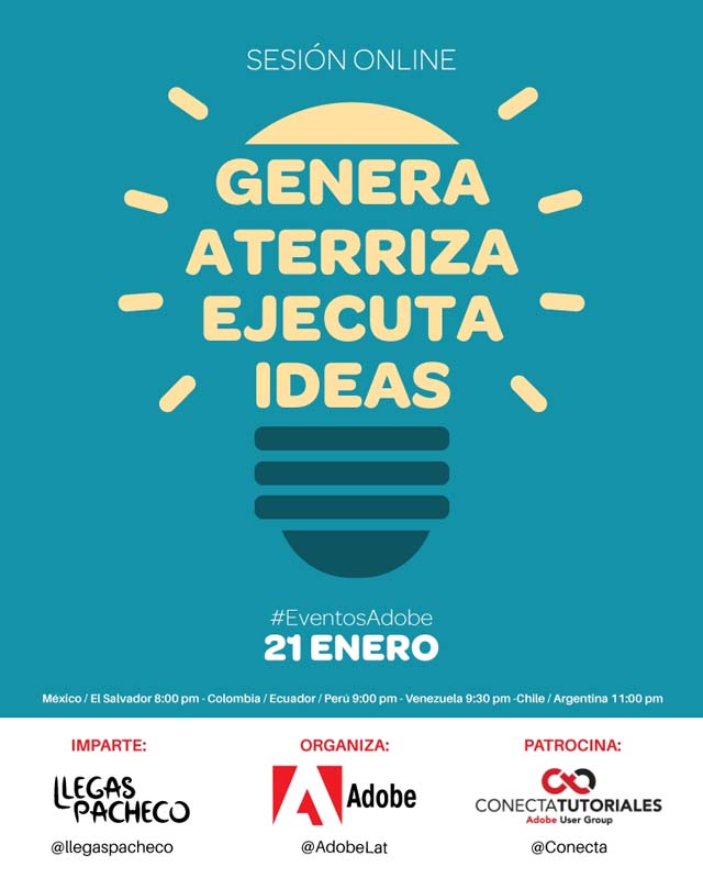 México, DF, 20 de enero de 2014.- Adobe (Nasdaq:ADBE), siempre a la búsqueda de iniciativas que le acerquen a la comunidad de usuarios de sus emblemáticas marcas, trae para América Latina El Webinar “Genera, aterriza y ejecuta ideas”. El evento tendrá lugar este miércoles 21 de enero a las 8:00 pm (hora MX).