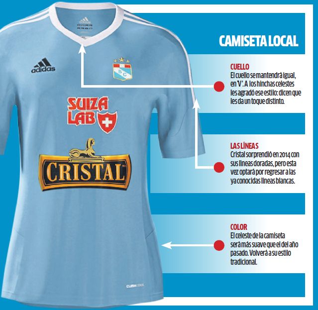 La camiseta alterna sí sufrirá un cambio mayor. En 2014, esa indumentaria mostraba un color azul eléctrico muy fuerte y líneas verdes fosforescentes. Después de cinco años, Sporting Cristal volverá a usar un color amarillo intenso (ver detalles en el cuadro).