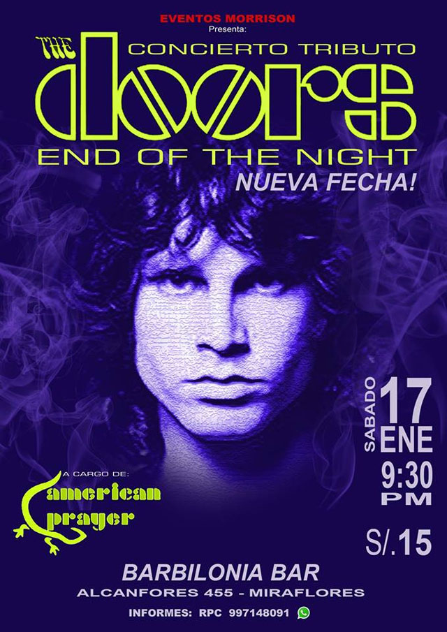 Eventos Morrison presenta un especial tributo en vivo a la banda americana The Doors: “End Of The Night” será una noche mágica, con la banda nacional American Prayer, quienes harán “encender nuestro fuego” en un show de más de 2 horas con las mejores canciones de la banda liderada por Jim Morrison.
