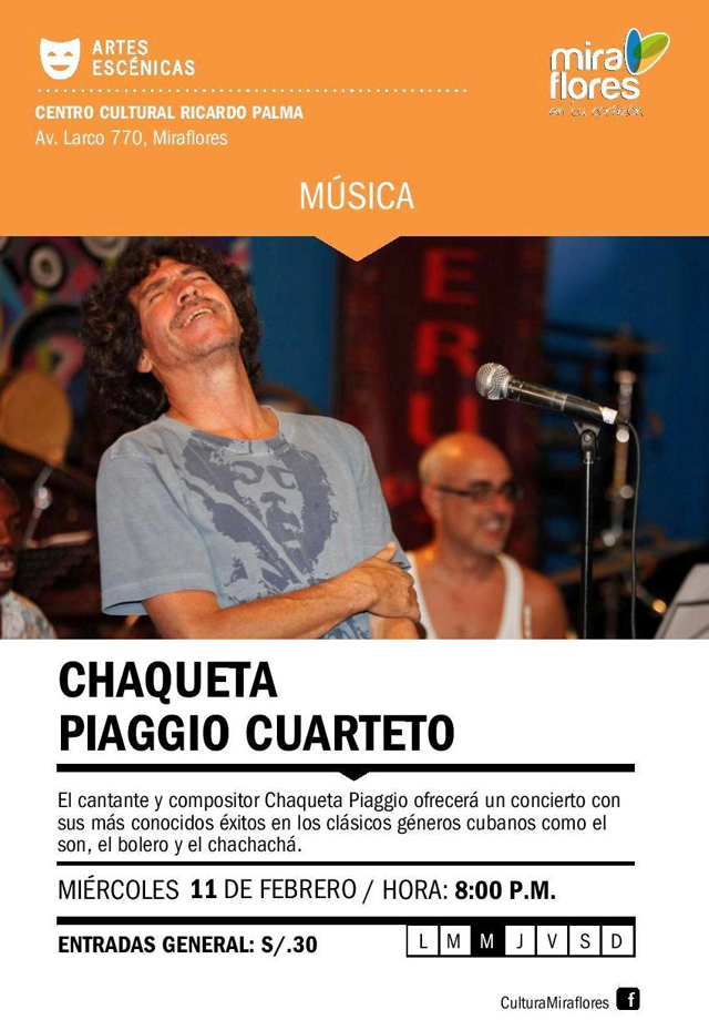 Mañana, miércoles 11 de febrero, se presenta “Chaqueta Piaggio y su Quinteto”, un concierto de ritmos cubanos con el conocido músico Chaqueta Piaggio, quien se estará presentando a las 7:30 p.m. en el Centro Cultural Ricardo Palma.