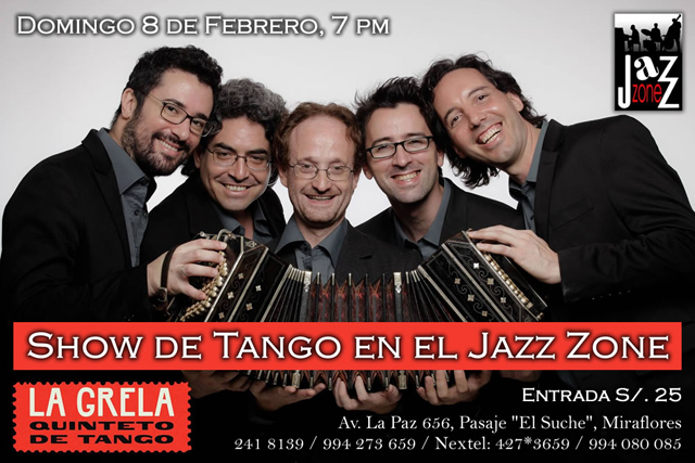 Aprovechando el regreso de su gira por Ecuador, La Grela Quinteto de Tango, agrupación conformada por destacados músicos argentinos, se presentará en Lima por única vez, el Domingo 8 de febrero, a las 7 pm, en el Jazz Zone de Miraflores.