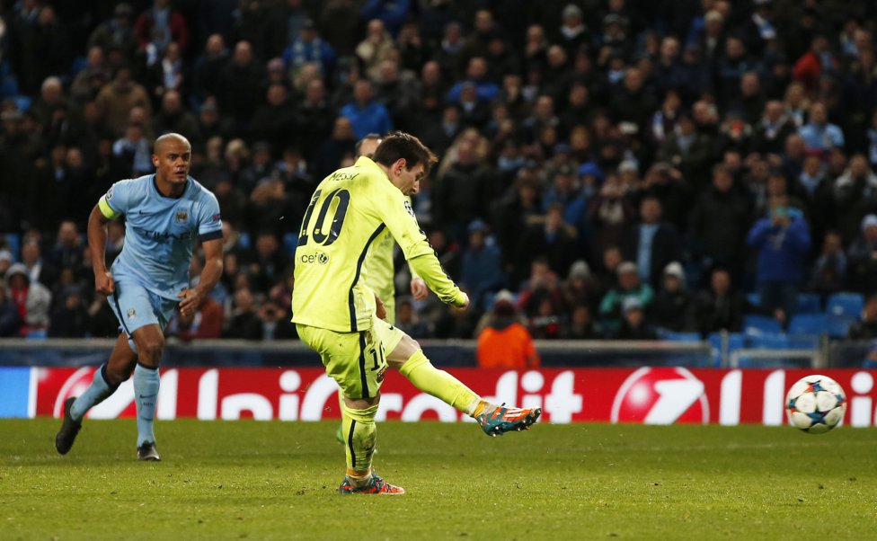 Messi disparó desde los doce pasos y Joe Hart atajó su remate. En seguida, la pelota le quedó para que Messi defina de rebote, y de golpe de cabeza, mandó el balón fuera del arco. Así, se negó la posibilidad de hacerse presente en el marcador y afrontar la vuelta ante el City con más tranquilidad.