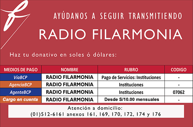 RADIO FILARMONIA, la radio cultural del Perú, necesita de tu apoyo para continuar transmitiendo. Ahora puedes hacer tu DONATIVO en SOLES o en DÓLARES en el BCP Banco de Crédito de una manera fácil y rápida: