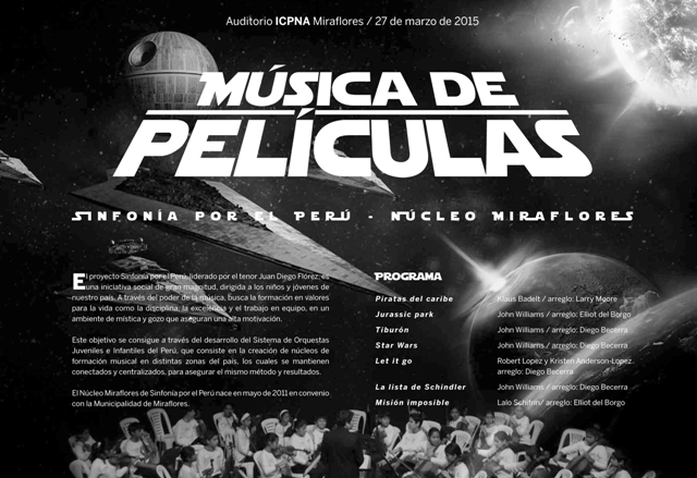 Recital orquestado con temas de filmes clásicos como “Star Wars”, “Misión imposible” o “Jurassic park”. El Núcleo Miraflores forma parte del Sistema de Orquestas Juveniles e Infantiles del Perú, organizado por el proyecto Sinfonía por el Perú, liderado por el tenor Juan Diego Flórez. Este concierto gratuito se realizará el viernes 27 de marzo a las 7:30 p.m. en el Auditorio ICPNA Miraflores.