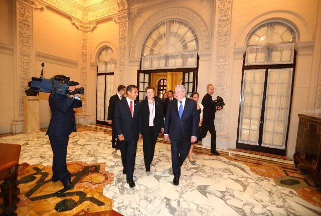 Joachim Gauck, quien cumple una vista oficial en el país, fue recibido esta mañana en Palacio de Gobierno , donde sostuvieron una reunión, acompañados de sus delegaciones oficiales.