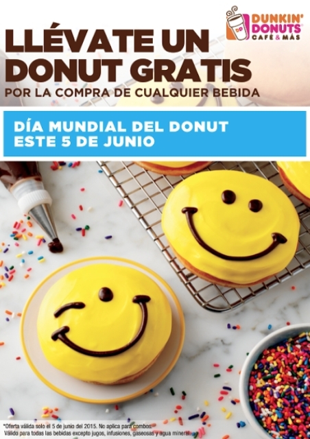 La promoción es válida solo el 05 de junio en todas las tiendas a nivel nacional. Solo aplica para bebidas de la marca Dunkin´ Donuts (cafés, iced y smoothies).