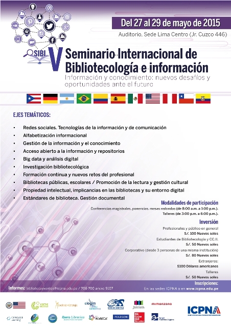 El Instituto Cultural Peruano Norteamericano (ICPNA), a través de su Dirección de Biblioteca, organiza el V Seminario Internacional de Bibliotecología e Información SIBI 2015 “Información y conocimiento: nuevos desafíos y oportunidades ante el futuro”, que se llevará a cabo del 27 al 29 de mayo en la sede Lima Centro (Jr. Cusco 446).