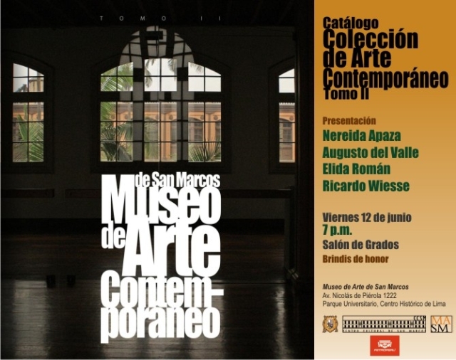 El Museo de Arte de San Marcos (MASM) invita al público en general a la presentación del segundo catálogo que reproduce el acervo histórico-artístico de la Colección de Arte Contemporáneo que custodia. Dicho evento se realizará el viernes 12 de junio a las 7:00 p.m. en el Salón de Grados del Centro Cultural de San Marcos (CCSM).
