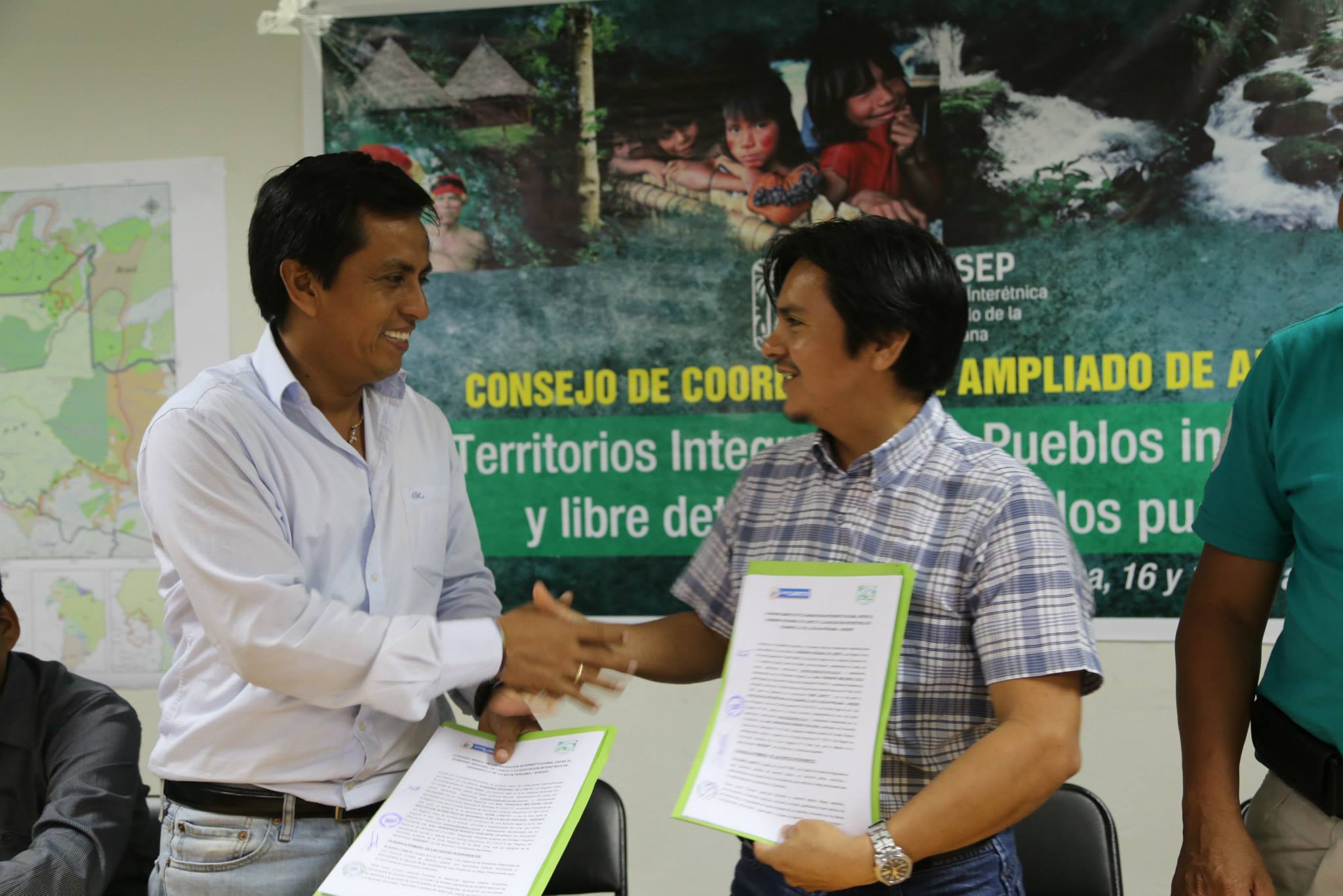 Estuvieron presentes en la firma de convenio, Henderson Rengifo, presidente de Aidesep, Fernando Meléndez, gobernador de Loreto, Jamner Manihuari, vicepresidente de Aidesep, Sedequías Ancón, tesorero Aidesep, Bernabé Impi, secretario Aidesep, Marcial Mudarra, presidente de Corpi-SL yNestor Murayari, miembro del consejo de ORPIO.