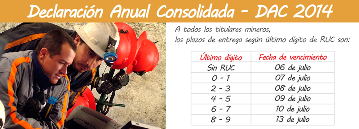 El MEM reitera a los titulares de la actividad minera que a partir del 6 de julio vence el plazo para presentar los demás anexos de la DAC (I, II, III, IV y V) correspondiente al año 2014, según el último número de RUC del titular minero, de acuerdo el cronograma siguiente: