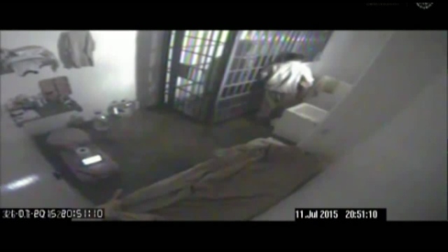 En un momento, el reo se sienta en la cama para cambiarse de calzado, vuelve a caminar hacia su ducha, se agacha y desaparece por un agujero que no es visible en el video.