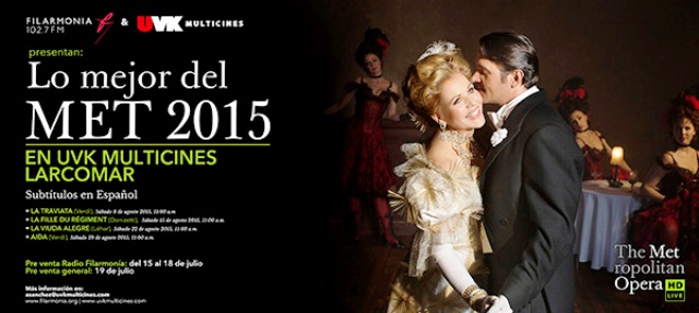 Radio Filarmonía y UVK Multicines Larcomar se complacen en anunciar la realización de LO MEJOR DEL MET EN HD 2015, con la presentación de cuatro óperas: LA TRAVIATA de Verdi, LA HIJA DEL REGIMIENTO de Donizetti con Juan Diego Flórez, LA VIUDA ALEGRE de Léhar y AIDA de Verdi, los días sábado 8, 15, 22 y 29 de agosto respectivamente a las 11:00 de la mañana en UVK Multicines Larcomar.