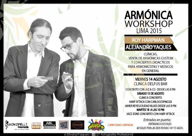 Gracias a Almas Raíces Producciones, Asociación de Blues de Lima, Asociación de Jazz de Lima, Hostel Kokopelli, Jamaica Bar y La Parada Sanduchería, vuelve a presentar la SEGUNDA EDICIÓN DE CLÍNICAS DE ARMÓNICAS (DIATÓNICAS Y CROMÁTICAS) Y CONCIERTOS EN VIVO DE BLUES, JAZZ, BOSSA NOVA al lado de dos máximos exponentes del instrumento desde Argentina regresa Roy Harpman y esta vez junto a su compatriota Alejandro Yaques. La cita es en las fechas viernes 14 y sábado 15 de Agosto del presente año en el Delfus Bar de Miraflores desde las 8PM.