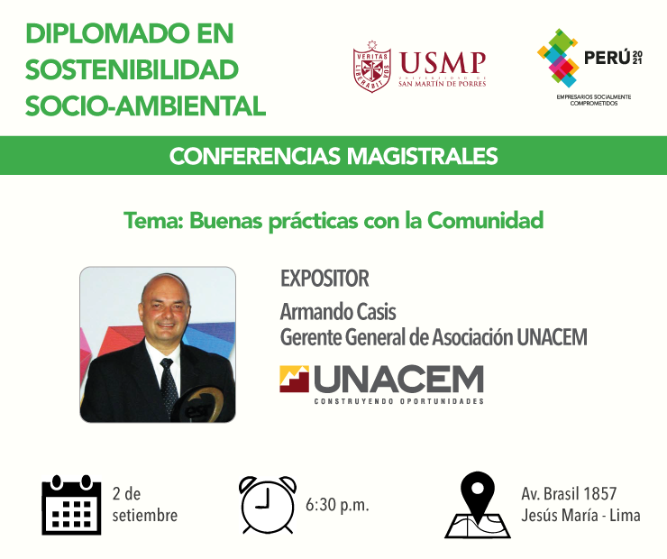 En el marco del Diplomado en Sostenibilidad Socio Ambiental que viene desarrollando Perú 2021 y la Universidad de San Martín de Porres USMP, a través de su Instituto para la Calidad Empresarial, se invita al público en general a las conferencias magistrales gratuitas que se estarán dictando los días 2, 9 y 16 de setiembre en las instalaciones de la Escuela de Post Grado de la Facultad de Ciencias Administrativas y Recursos Humanos ubicado en la Av. Brasil 1857 Jesús María.