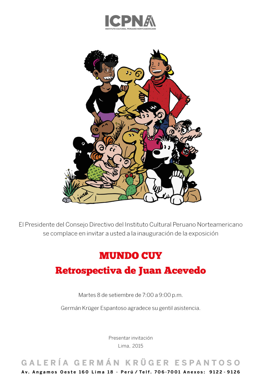 “MUNDO CUY. EXPOSICIÓN RETROSPECTIVA DE JUAN ACEVEDO”. La muestra reúne una amplia producción de dibujos que fueron publicados en periódicos, revistas y libros durante los últimos cuarenta años por Juan Acevedo, uno de los caricaturistas peruanos que ha explorado la historieta en sus más diversas posibilidades. Su destreza narrativa excepcional se puede apreciar en la historieta política (Love Story), la estampa (Ciudad de los Reyes), la historieta literaria (Paco Yunque), la historieta histórica (Túpac Amaru y La historia de Latinoamérica desde los niños), así como la historieta de superhéroes (La Araña No), la historieta de autor (Pobre diablo) y la historieta de humor y aventuras encarnadas por su alter ego, el Cuy. Curaduría: Manuel Munive. Lugar: Galería Germán Krüger Espantoso (Av. Angamos Oeste 160). Hasta el 18 de octubre. De martes a domingo de 11:00 a.m. a 8:00 p.m. Visita guiada a cargo del curador: viernes 25 de setiembre, 7:00 p.m. Ingreso libre.