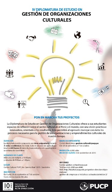 La Facultad de Gestión y Alta Dirección presenta la IV Diplomatura de Estudios en Gestión de Organizaciones Culturales que ofrece a sus estudiantes espacios de reflexión sobre el sector cultural en el Perú y el mundo, con una visión práctica y orientada a los resultados.