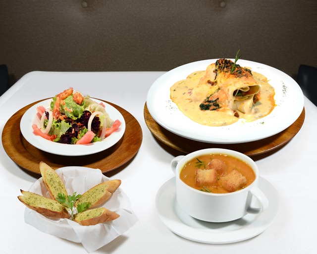 En este delicioso festín de pastas artesanales encontramos para su elección como entrada: Sopa de toscana y crutones artesanales y la suculenta ensalada a la Nonna (tiras de pollo, manzanas, mix de lechugas, pasas, aros de cebolla en aliño a la naranja) con vinagreta de cuatro quesos. Luego como plato de fondo podrán escoger entre los riquísimos canelones rellenos de lomito stragonoff o la lasagna al pesto genovés con tomates deshidratados y queso Philadelphia.