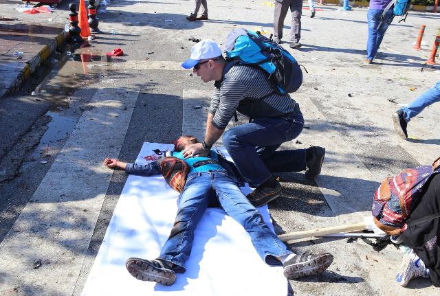 Un fotógrafo de la AFP vio tras las explosiones cadáveres de activistas en el suelo, con las pancartas que habían traído para la manifestación.