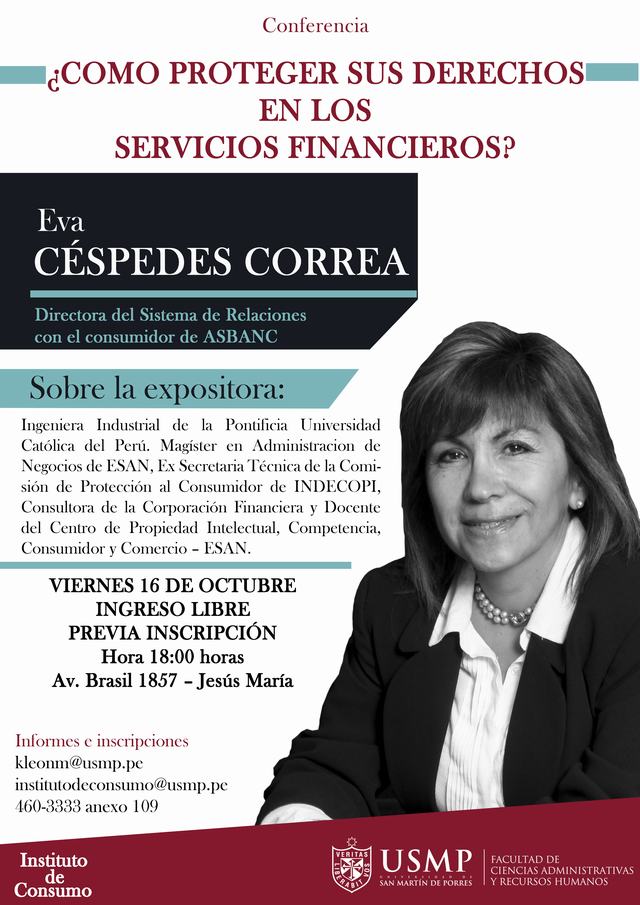 El Instituto de Consumo de la Universidad de San Martín de Porres USMP anuncia la Conferencia Gratuita: “¿Cómo proteger sus derechos en los servicios financieros?” a realizarse el próximo 16 de octubre a las 6:00 pm en las instalaciones de la Escuela de Post Grado de la Facultad de Ciencias Administrativas y Recursos Humanos ubicado en la Av. Brasil 1857 Jesús María.