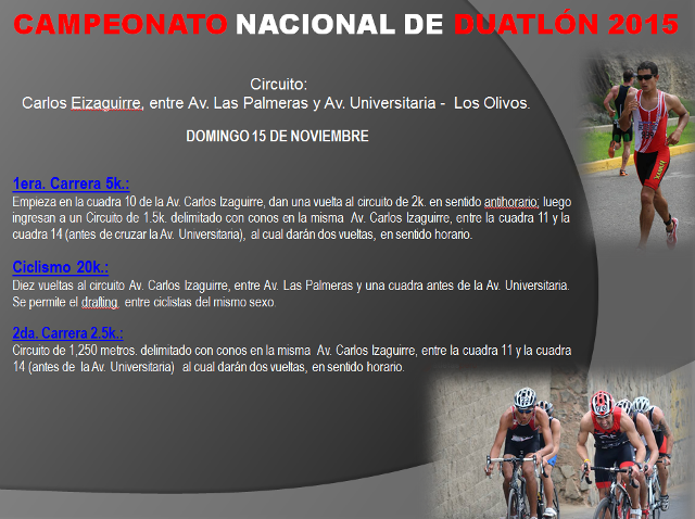 El domingo 15 de noviembre, se llevará a cabo el Campeonato Nacional de Duatlón, deporte que es una variante del Triatlón, consistente en correr 5 kilómetros, luego montar bicicleta 20 kilómetros y finalmente volver a correr 2.5 kilómetros.