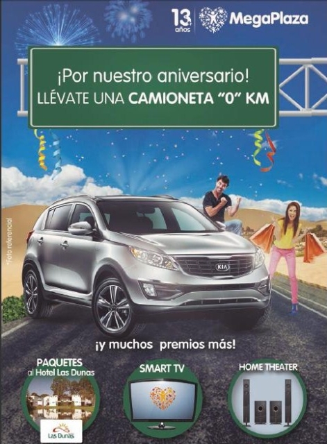 MegaPlaza, el centro comercial pionero de Lima Norte, premia a sus visitantes, por sus 13 años de aniversario, con el super regalo de una camioneta “0” kms Kia Sportage, a través del sorteo que se realizará el sábado 28 de noviembre a las 6.30 p.m. en el escenario principal.