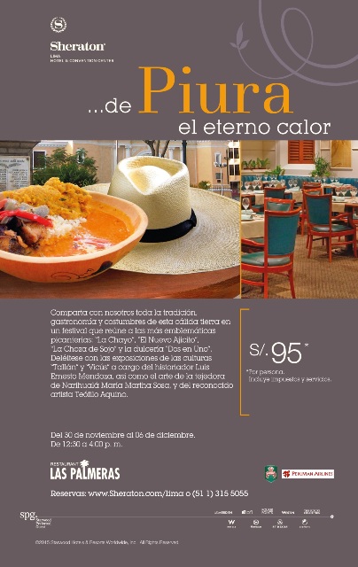 Toda la tradición, gastronomía y costumbres de la cálida ciudad de Piura se estará ofreciendo en el restaurante Las Palmeras en el horario de 12:30 a 4:00 p.m., del lunes 30 del presente mes al 06 de Diciembre.