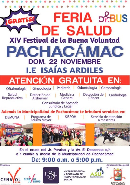 La Universidad San Ignacio de Loyola en alianza con el Centro Nacional de Voluntariado (CENAVOL) y la Municipalidad de Pachacámac, realizarán el XIV Festival de la Buena Voluntad en donde ofrecerán servicios gratuitos básicos de salud, educativos y recreativos, así como charlas a la comunidad a cargo de las carreras de la USIL.