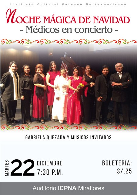 “NOCHE MÁGICA DE NAVIDAD – MÉDICOS EN CONCIERTO”. El presente concierto cuenta con la participación de las sopranos Gabriela Quezada, Cecilia Solís, María del Carmen Quiroz y Liliana Choza; el tenor Arturo Vigo, el barítono Mario Castro, la declamadora Rosa Luz López y los pianistas Edgar Ruiz y Simón Vela. Lugar: Auditorio ICPNA Miraflores (Av. Angamos Oeste 120). Hora: 7:30 p.m. Boletería: S/.25.