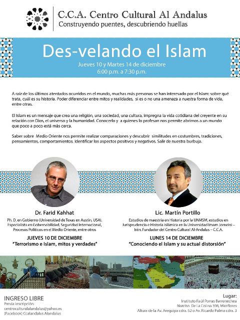 6:00 a 7:30pm. Conferencia “Des-velando el Islam” Organiza: Centro Cultural-Andaluz. Expositores Farid Kahhat y Martin Portillo. Más información: