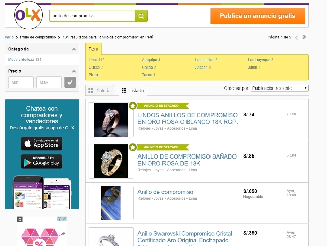 “Sin embargo, para aquellos novios que prefieran desafiar esta tendencia, en OLX tenemos registrados más de 130 avisos que ofrecen anillos de compromiso, con valores que van desde los S/ 40 a los US$ 1,600”, puntualizó el Gerente de Expansión en Latinoamérica de OLX.