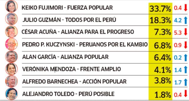 CPI: Keiko Fujimori primera con 33.7% y Julio Guzmán segundo con 18.3%